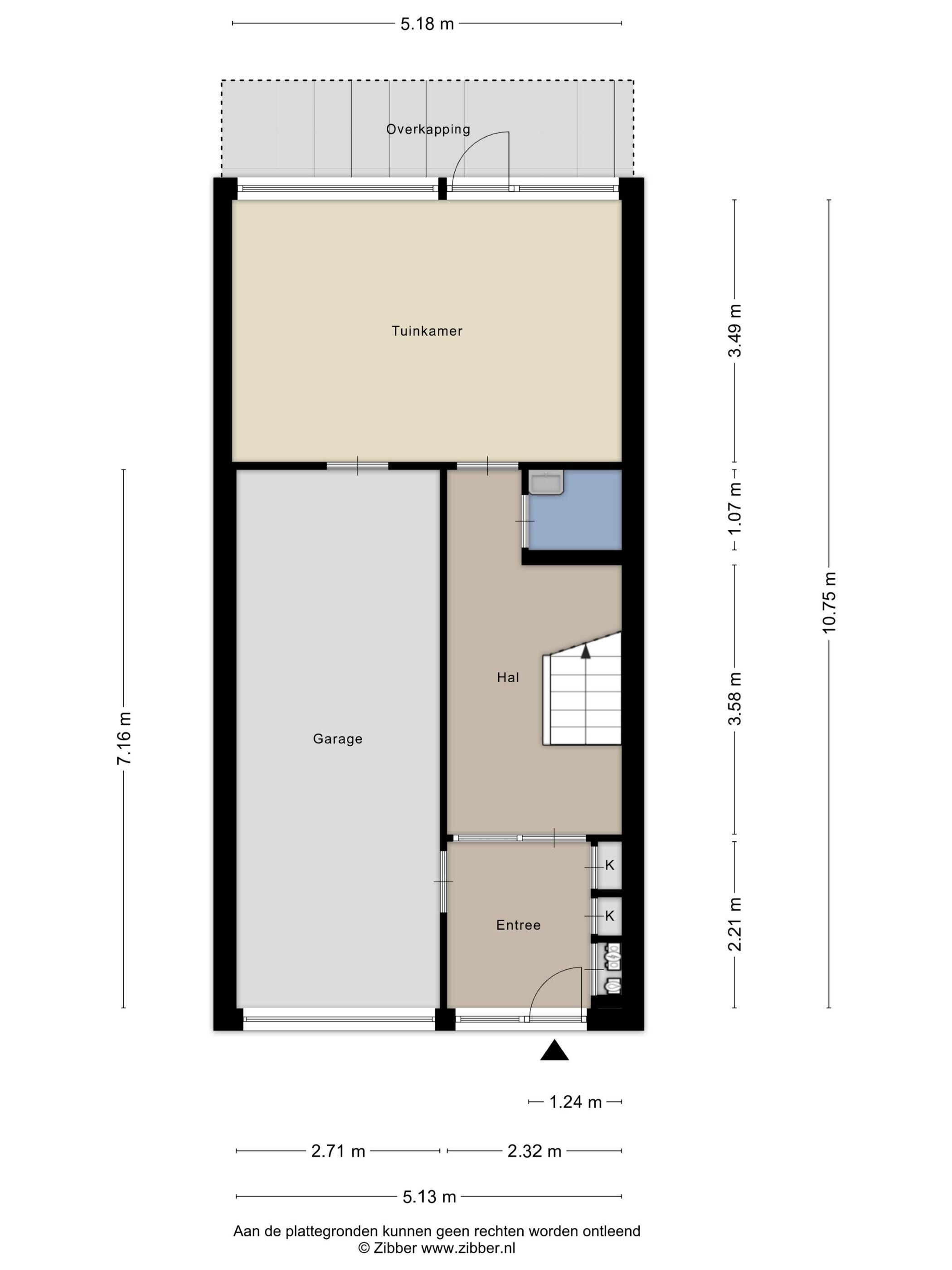 Entree, hal, meterkast (glasvezel aanwezig), deur naar de garage en doorgang naar de gang met trap naar de eerste verdieping, berging met stortbak en doorgang naar de royale en lichte tuinkamer. Vanuit de tuinkamer bereikt u tevens de garage alsook de tuin op het zuiden gelegen.
